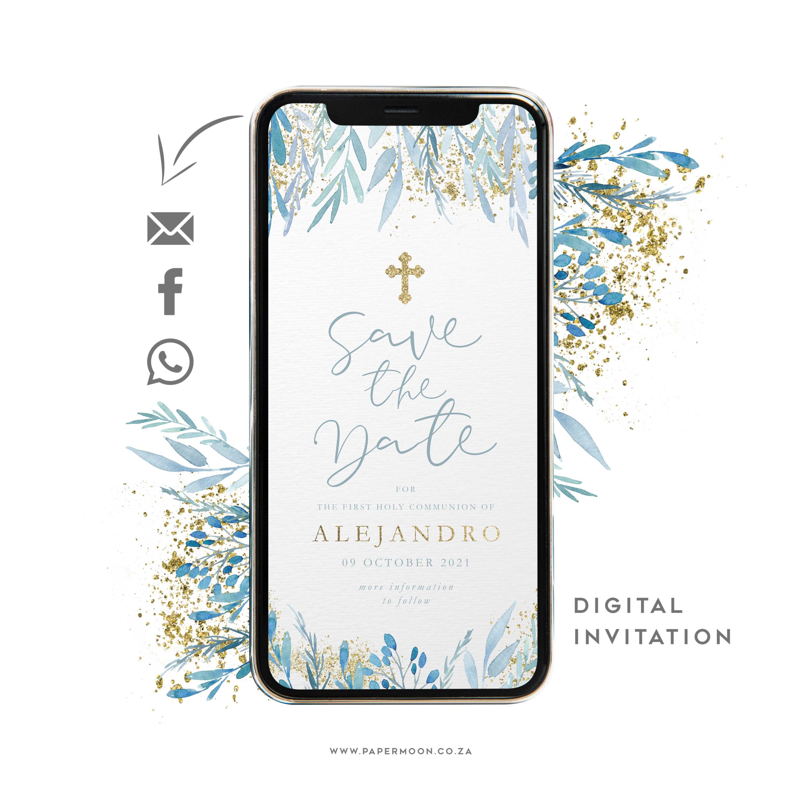 A Blue & Gold Leaf Baptism Save the Date that is ready to send!