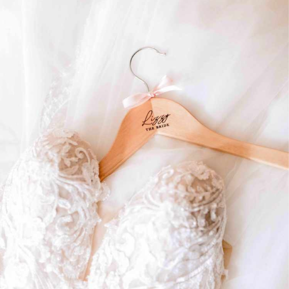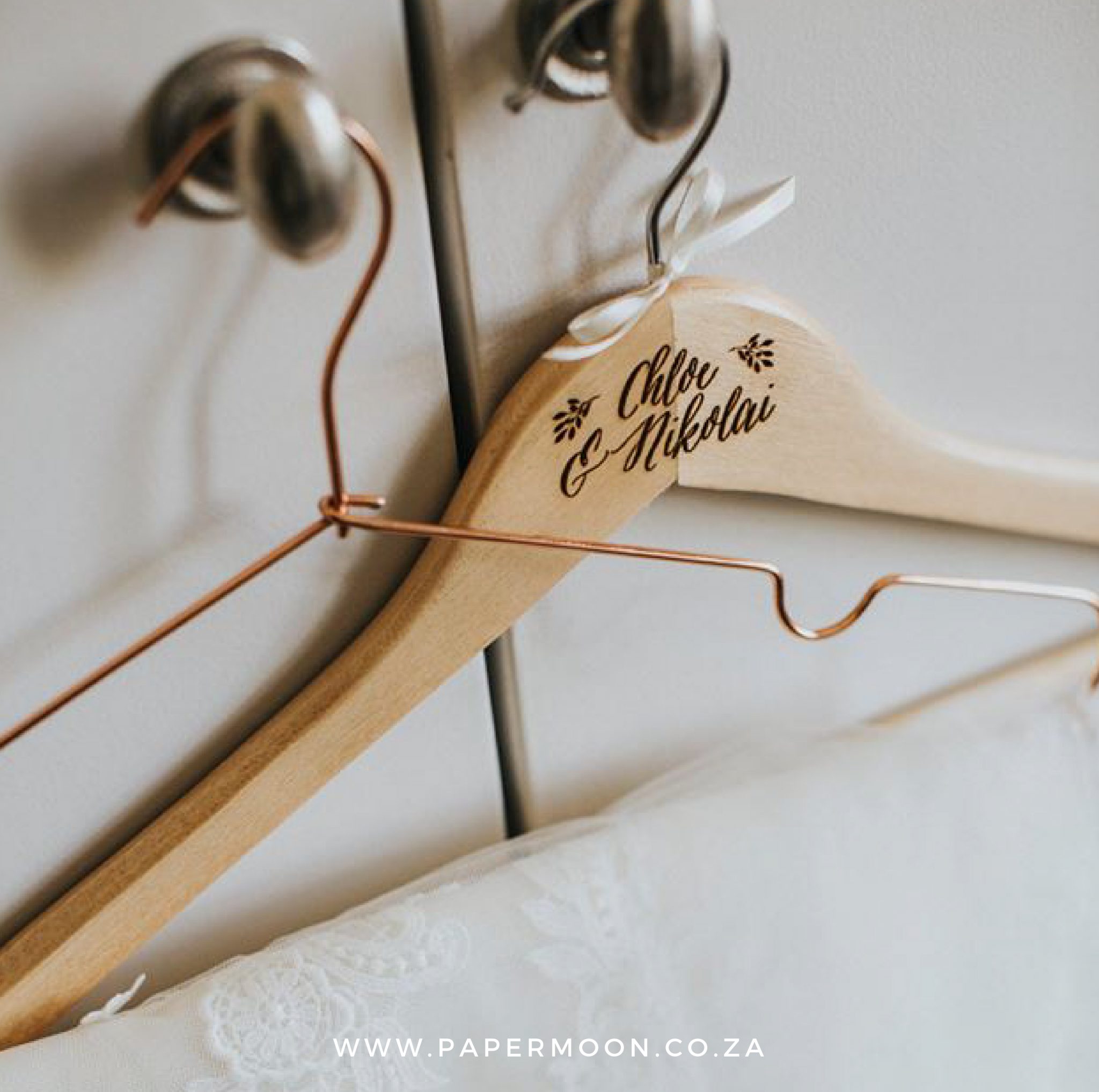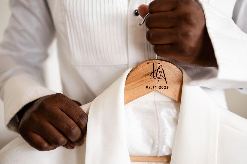 Wooden Wedding Hanger with engraved name and date or monogram design, perfect for bridal party gifts or groomsmen gifts, or as wedding keepsakes.