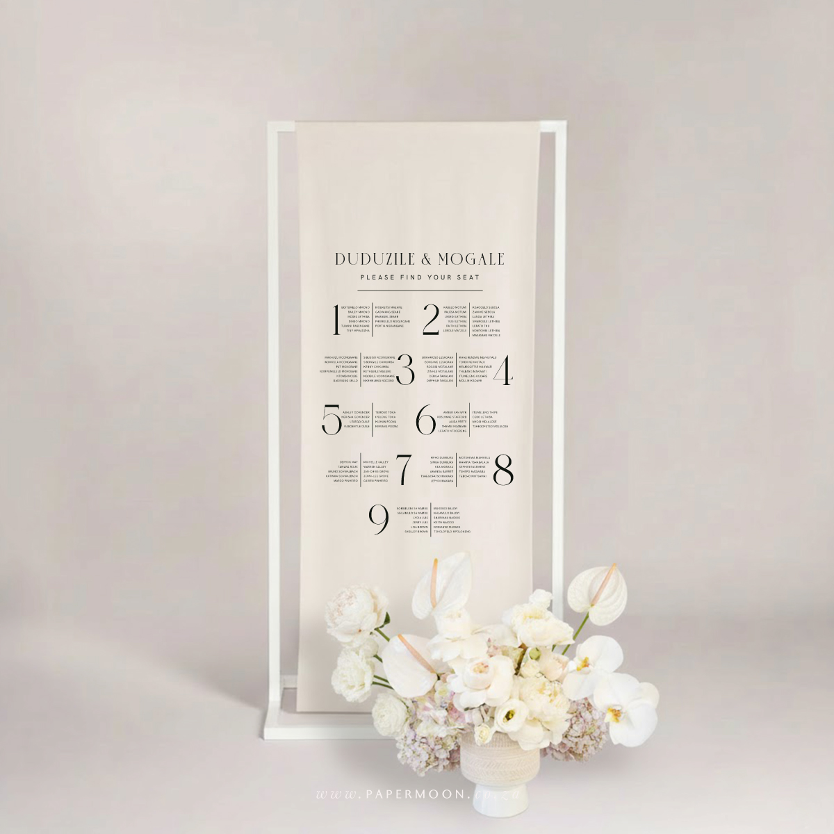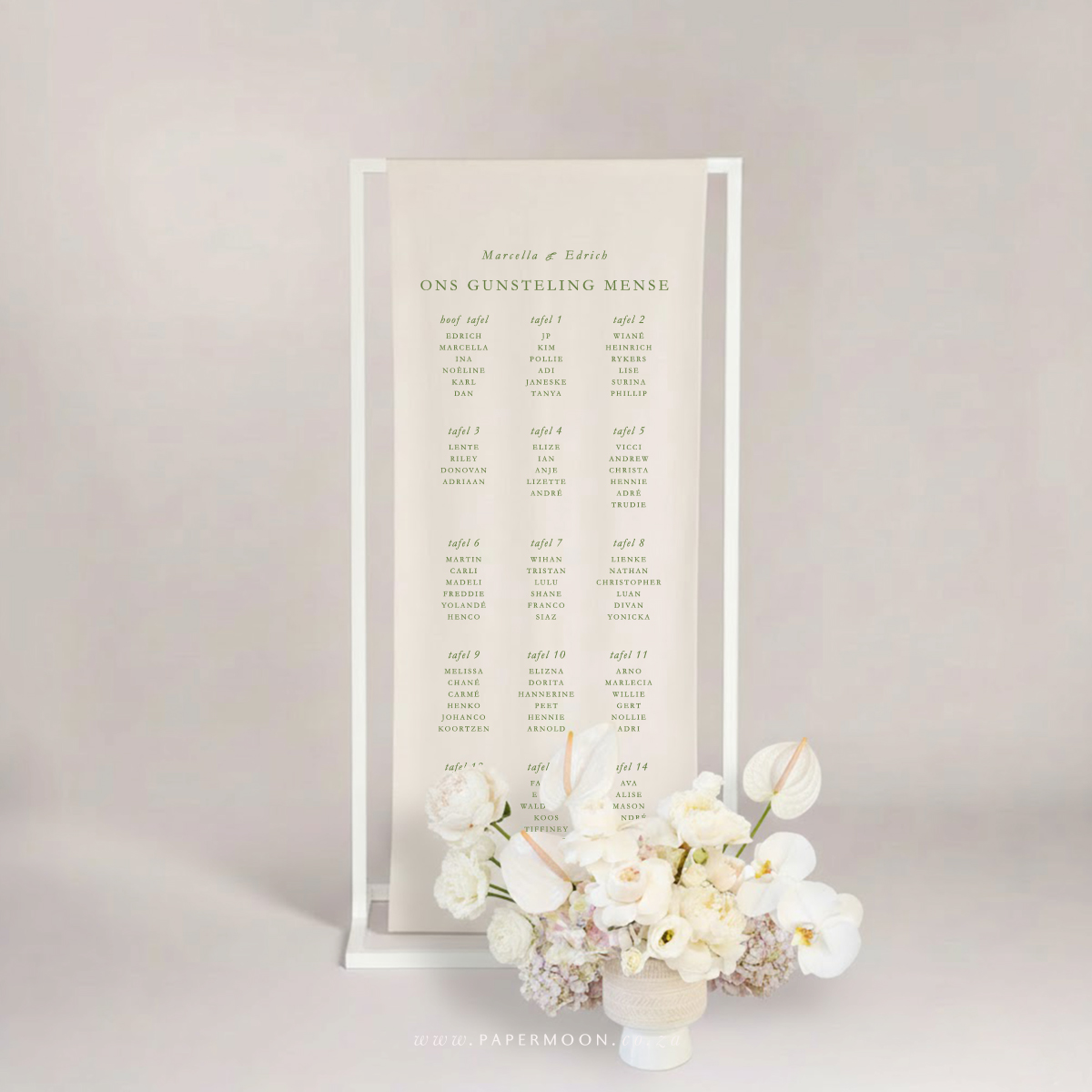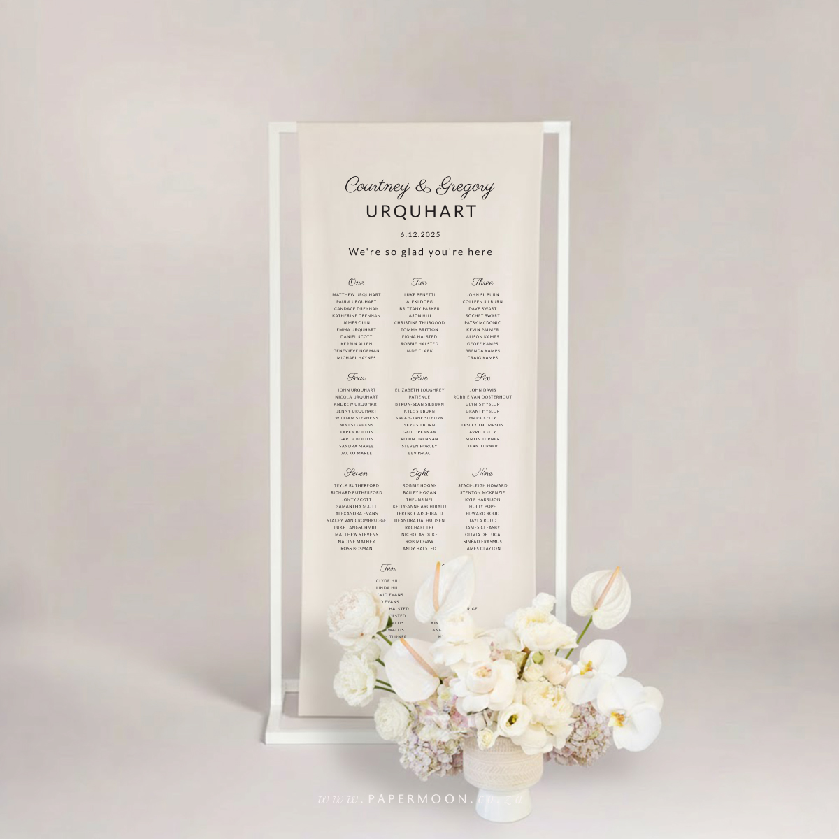 Linen Seating Chart – available in off white or white calico linen. Printed with your custom table layout and guest names.