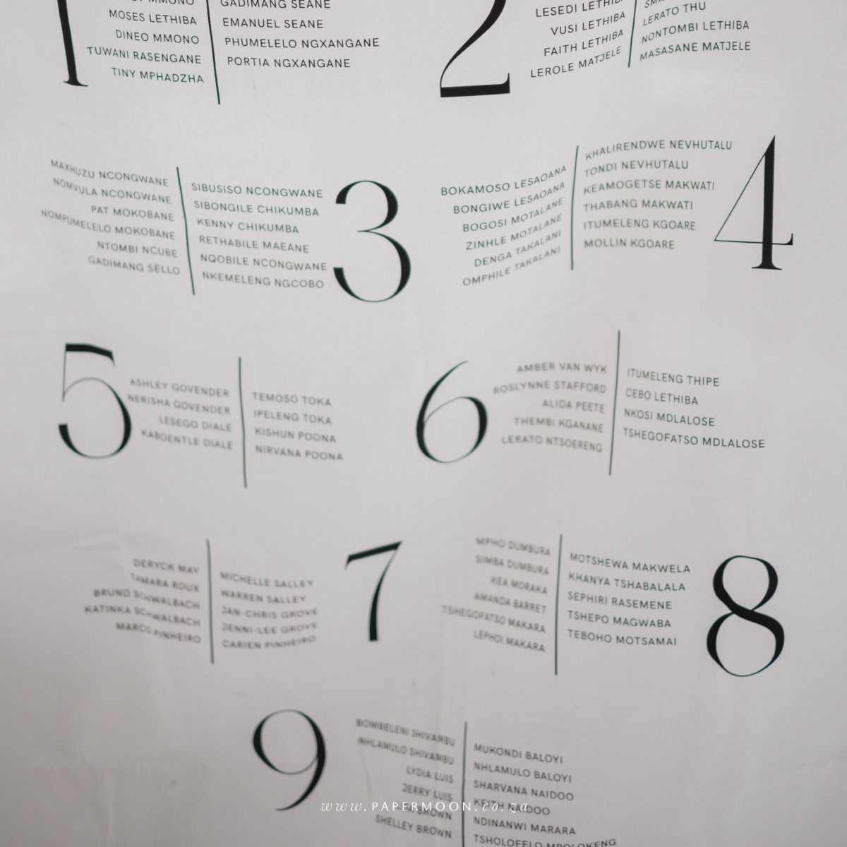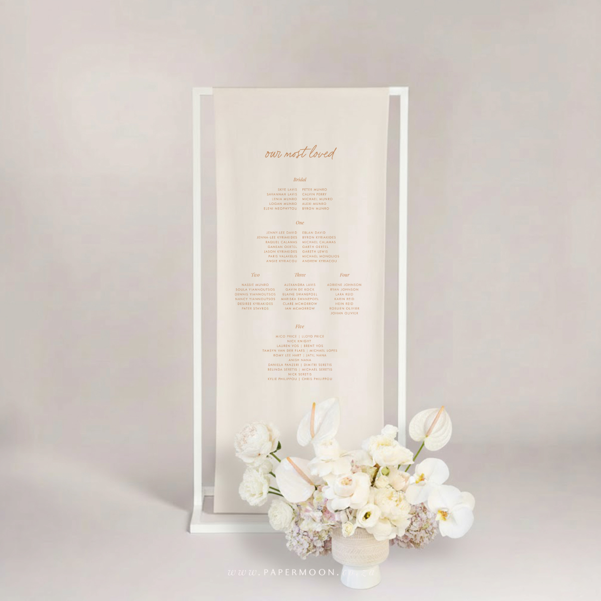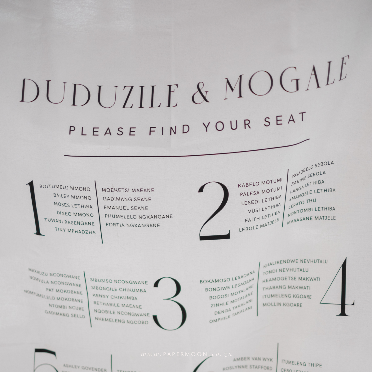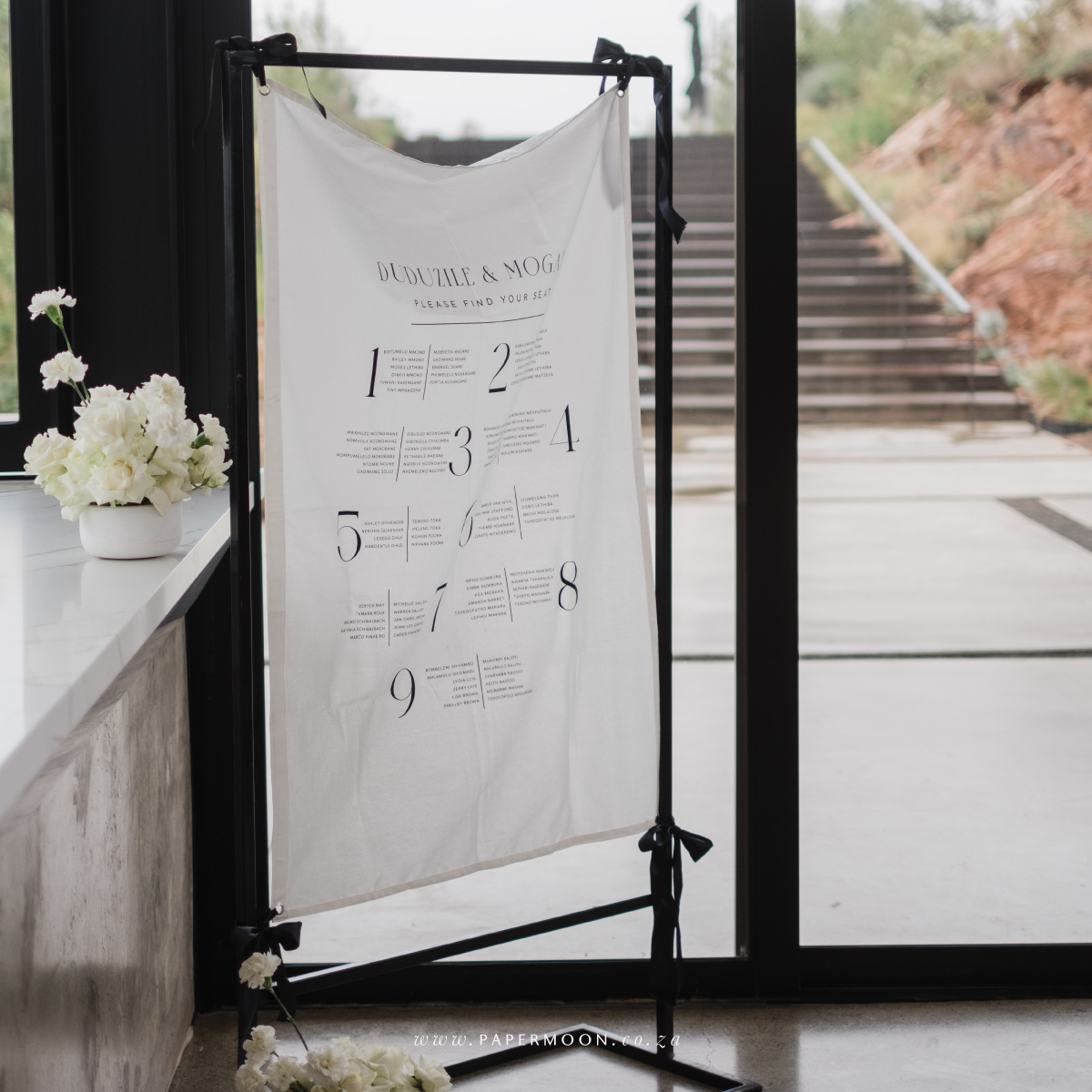 Linen Seating Chart – available in off white or white calico linen. Printed with your custom table layout and guest names.