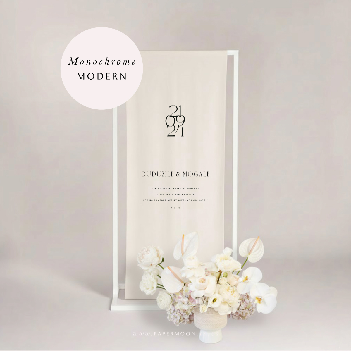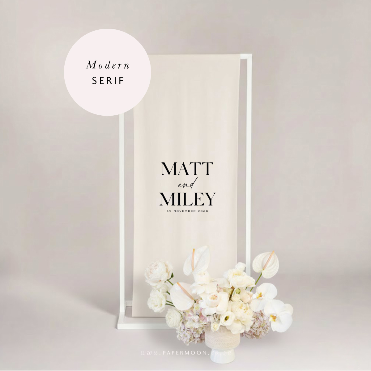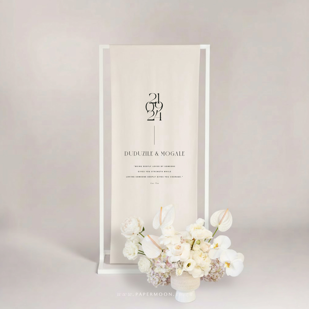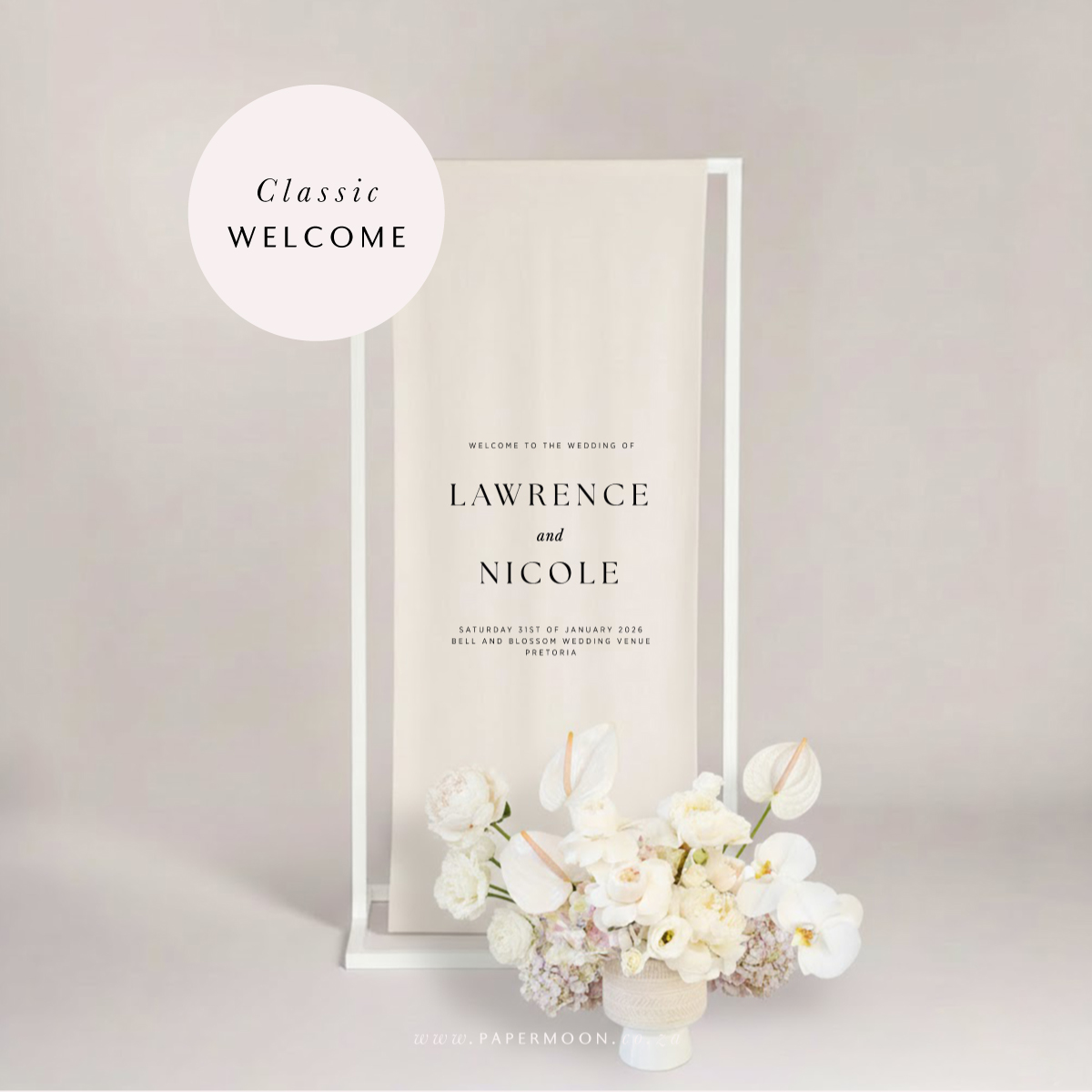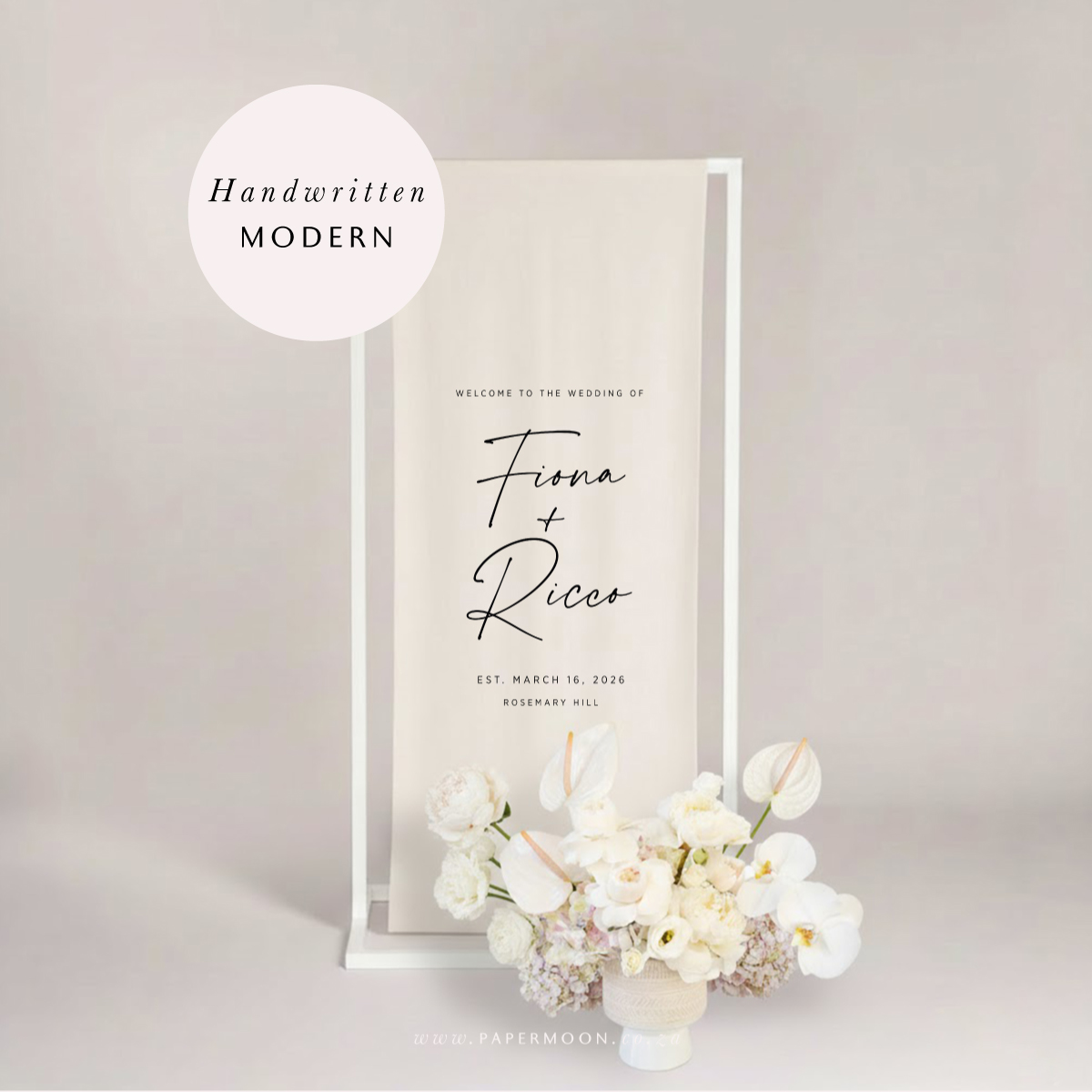 Linen Welcome Sign – available in off white or white calico linen. Printed with your custom details.