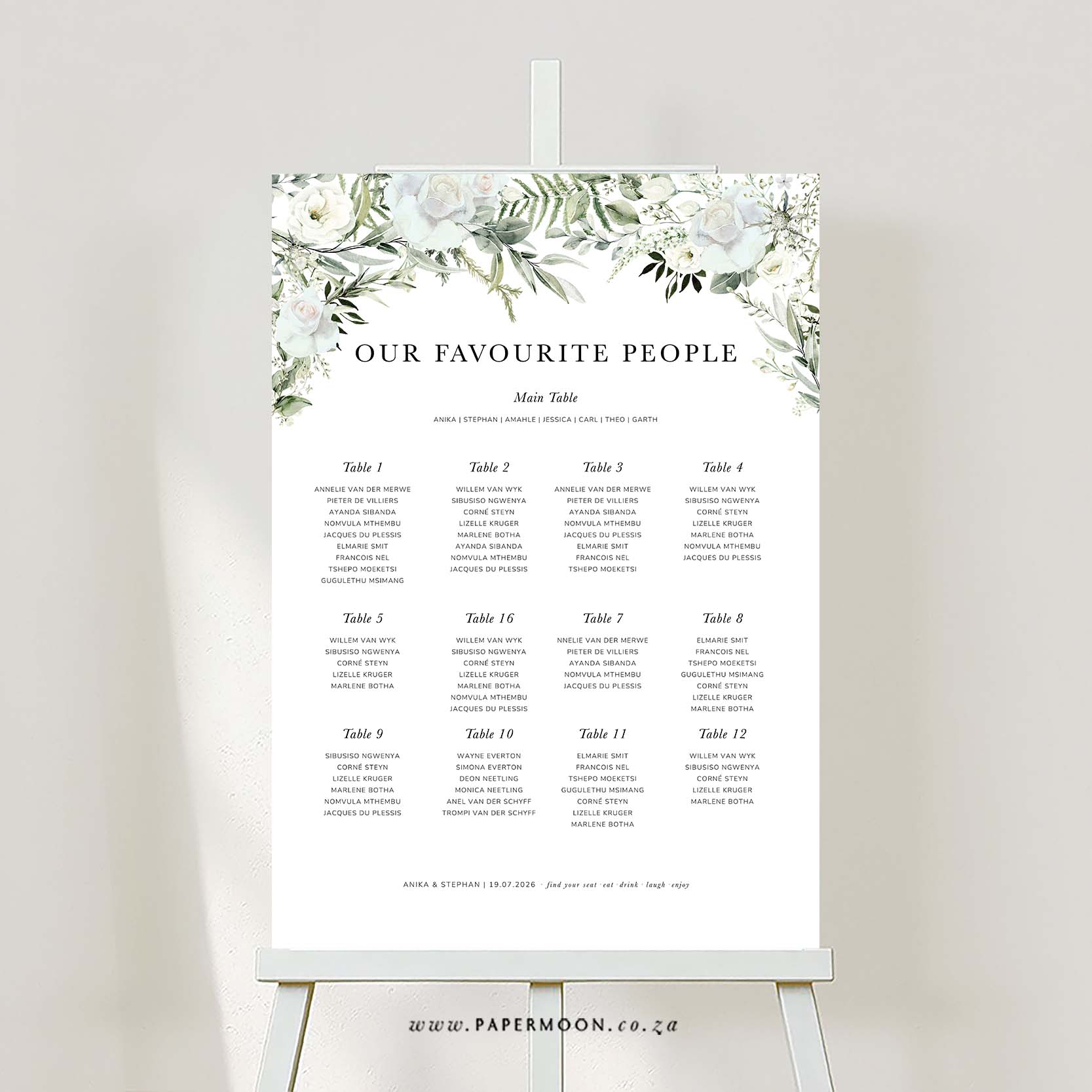 Perfect for a seating chart display – a beautiful organic frame of greenery, white roses and sage elements.