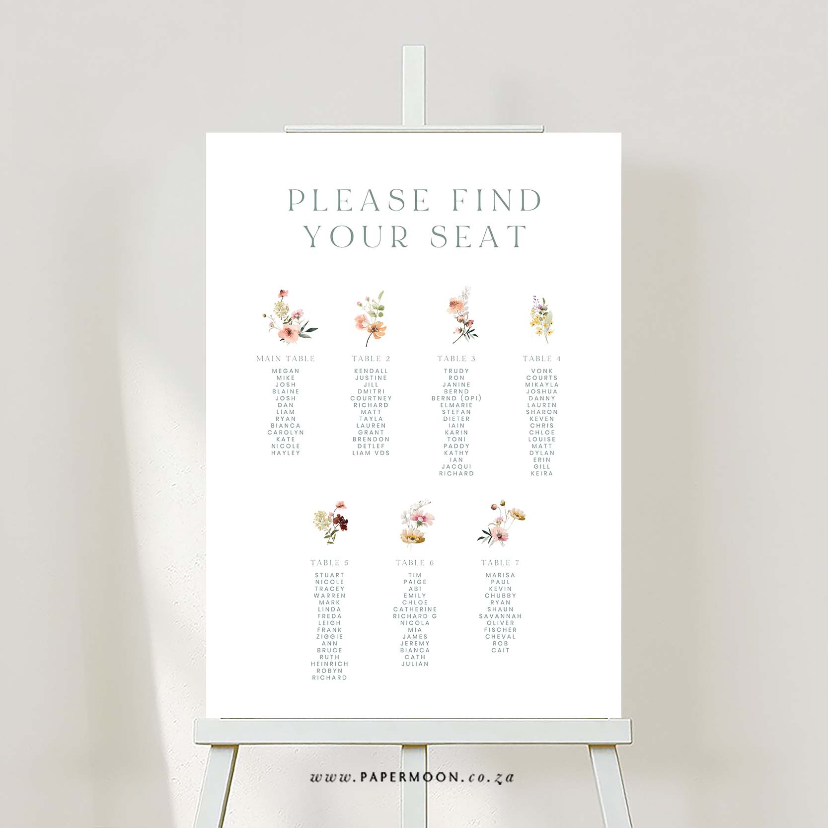 Perfect for a seating chart display, with pastel / autumn & beige watercolour florals.