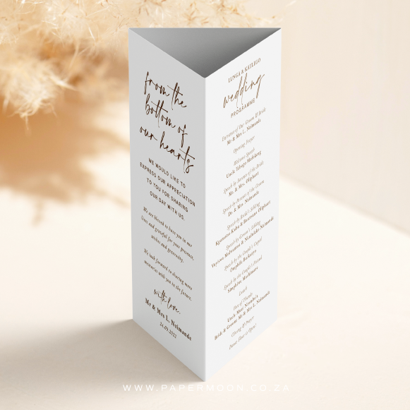 A standing triangle fold table number with menu and thank you/welcome message (3 sided) – a pretty and simple alternative for menu and table number combos.
