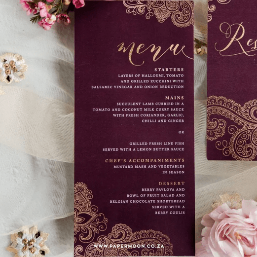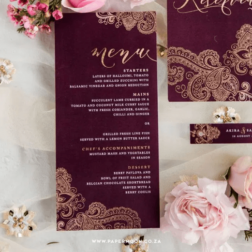 Home / Weddings / Wedding Stationery / Wedding Menus / Maroon Mehndi Menu